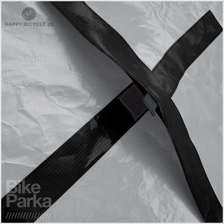 Tem um fundo elástico para melhor se ajustar em torno das rodas e ilhóses para fechar com um laço ou um cadeado pequeno . A cobertura pode ser ajustada para se adequar a quase todos os selins e guiadores (até 65cm).