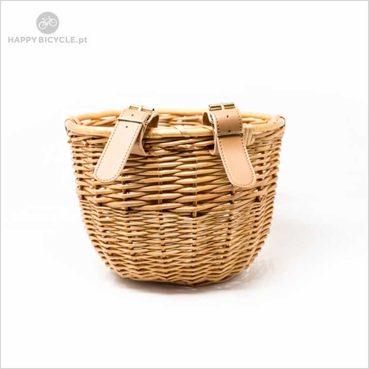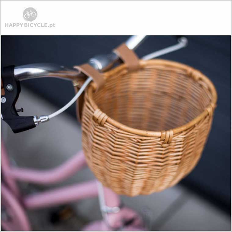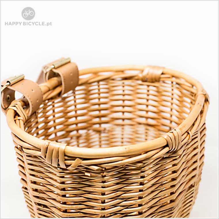 Cesta em tamanho reduzido fabricada em verga castanha. Para fixar no guiador através de práticas fivelas de pele sintética removíveis.