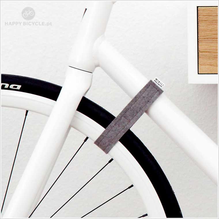 Prende-Calças/Strap com dupla função como Prende-Roda, quando está arrumado no suporte de parede. Por outras palavras, ela protege as calças enquanto passeia e a parede quando está em casa.