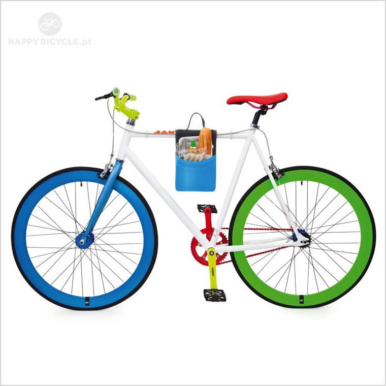 A bolsa (de pendurar no tubo superior) é feita de lona cinza escura, com tiras de velcro para manter os dois lados sobre o quadro da bicicleta juntos. Os compartimentos são revestidos a azul neon.