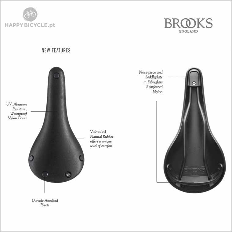 Nova geração de selins da Brooks, em borracha natural vulcanizada com revestimento de Nylon à prova de intempéries, para um desempenho impecável em todas as condições, oferecendo a longevidade lendária da Brooks com um conforto extraordinário e uma excepcional liberdade de movimentos.