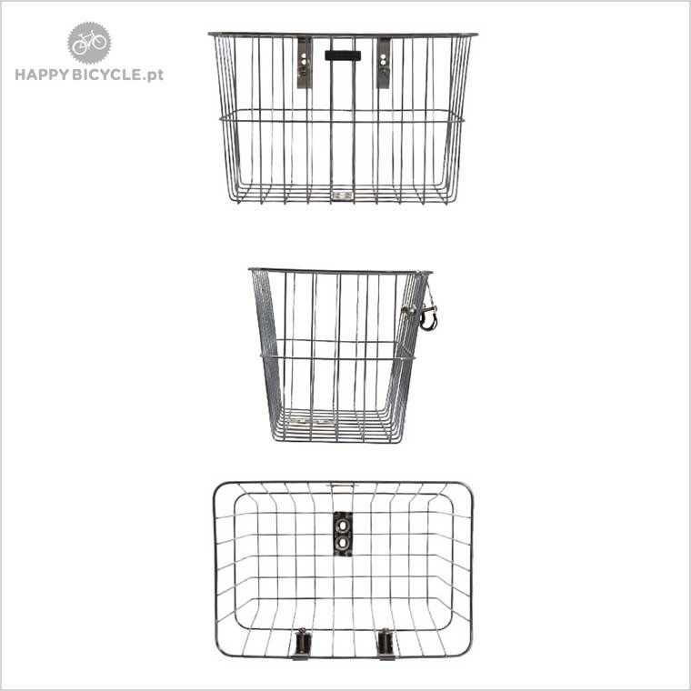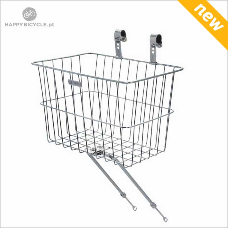 Cesto em estrutura metálica, com 4 pontos de fixação, dois no guiador e dois no eixo da roda dianteira (com ajuste).