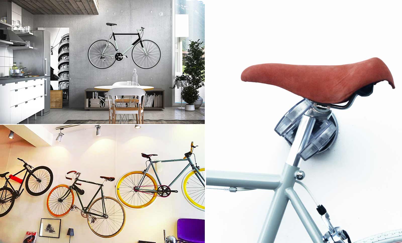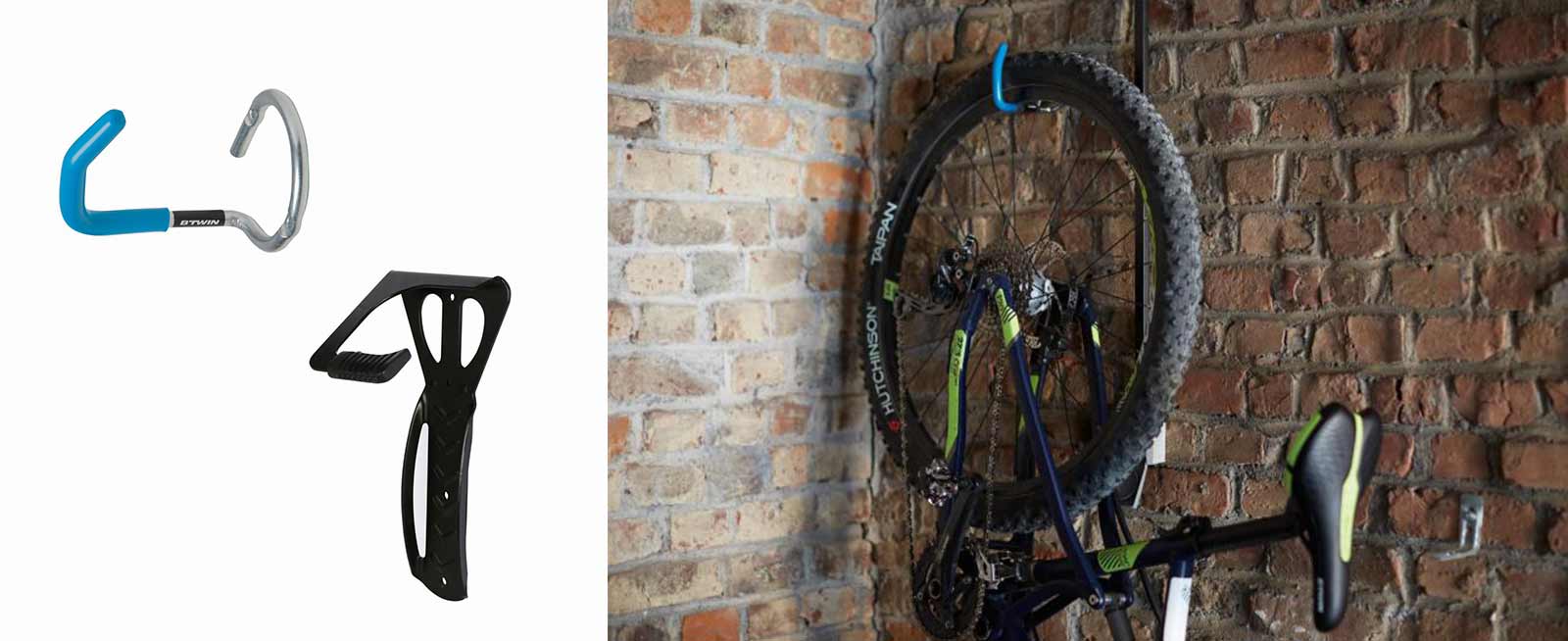 Pendurar bicicleta na parede, na vertical, é um óptima solução, amplamente utilizada tanto por profissionais como em garagens. São fáceis de aplicar e poupam espaço no solo.