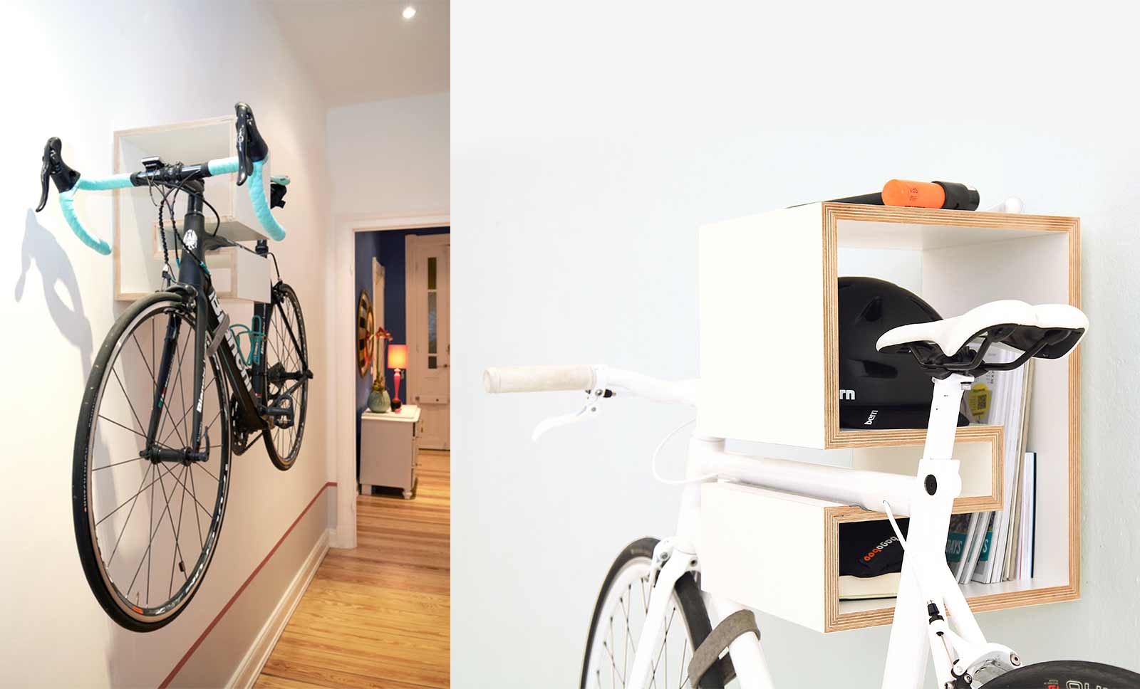 Que tem a vantagem de ser também um móvel, possibilitando a arrumação no mesmo local de todos os acessórios que coabitam com a bicicleta, quer sejam o capacete, as luvas, as luzes, etc…